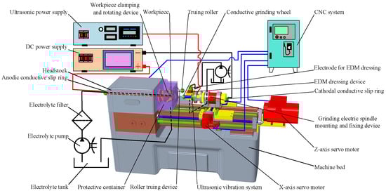 Like the ordinary internal cylindrical grinding machine tool, the ICUAECG machine tool mainly consists of the machine bed, workpiece clamping and rotating device, a grinding electric spindle mounting and fixing device, etc. In addition, according to the requirements of ultrasonic vibration and ECG, the electrolyte circulating supply device, DC power supply device, on-machine dressing device of the conductive grinding wheel, numerical control system, ultrasonic vibration system, and other devices need to be equipped. The main components of the ICUAECG machine tool are depicted in Figure 2.