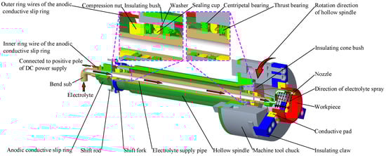 According to the above requirements, the workpiece clamping and rotating device design is shown in Figure 4. The device is mainly composed of the hollow spindle of the machine tool, electrolyte supply pipe, anodic conductive slip ring, insulating bush, insulating cone bush, nozzle, centripetal bearing, thrust bearing, sealing cup, shift fork, shift rod, and other parts. The insulating bushing, insulating cone bush made of nylon material, and centripetal bearing are used to support the electrolyte supply pipe installed in the hollow spindle to ensure good insulation between the electrolyte supply pipe and the hollow spindle to prevent the positive electricity of the workpiece from being transmitted to the machine bed through the electrolyte, electrolyte supply pipe, or hollow spindle during machining. The compression nuts and thrust bearings at both ends axially fasten the electrolyte supply pipe inside the hollow spindle and can flexibly rotate. The sealing cup prevents electrolyte and external dust from entering the hollow spindle. The inner ring of the anodic conductive slip ring is sleeved on the electrolyte supply pipe and fastened by the jackscrew. The shift fork and rod mounted on the hollow spindle are used to drive the outer ring of the anodic conductive slip ring to rotate with the hollow spindle. The inner ring wire of the anodic conductive slip ring is connected with the positive pole of the DC power supply. The outer ring wires of the anodic conductive slip ring pass through the wire-threading holes on the insulating bush and insulating cone bush and are connected with the conductive pads fixed on the insulating claws through the wiring screws. The insulating claws and conductive pads on the machine tool chuck are used to clamp and loosen the workpiece and ensure insulation between the workpiece and the machine body. The electrolyte nozzle is curved to avoid movement interference with the conductive grinding wheel during machining. The cylindrical surface on the side of the electrolyte nozzle is machined with a long and narrow electrolyte outlet to ensure that the electrolyte can be sprayed into the machining area along the direction shown in Figure 4, to reduce the electrolyte splash.