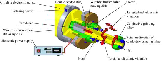 The wireless transmission stationary disk is fixed on the housing of the grinding electric spindle through fastening screws, and the sleeve is installed on the rotor of the grinding electric spindle. The wireless transmission moving disk is installed on the sleeve by screws, and the end clearance between the wireless transmission moving disc and the stationary disk is guaranteed to be 0.5 mm. The horn and the transducer are installed together through a double-headed stud and are installed in the sleeve through the flange plate on the horn. The conductive grinding wheel is installed on the horn and fastened with a nut.