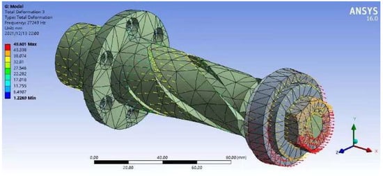 In the ultrasonic vibration system, the function of the horn is to improve the amplitude of the ultrasonic vibration by energy accumulation and transform part of the longitudinal vibration into torsional vibration. The shape and dimension of the horn have a crucial influence on the performance of ultrasonic vibration. In ultrasonic-assisted machining, to give full play to the energy accumulation and amplitude increase in the horn and make the tool obtain a good vibration effect, it is usually designed as a shape with a gradually reduced cross section [,,,,,]. Common horn shapes include conical, exponential, stepped and catenary [,,]. To facilitate processing, the conical horn is used in this study. Local resonance theory [,] is used to design and calculate the horn, and finite element analysis software simulates the vibration mode of the horn and harmonic response, as shown in Figure 6. After the horn was manufactured, it was installed in the ultrasonic vibration system of the machine tool, and the conductive grinding wheel was installed. The resonant frequency was measured by measuring the ultrasonic vibration amplitude of the conductive grinding wheel with a laser displacement sensor under no-load conditions.