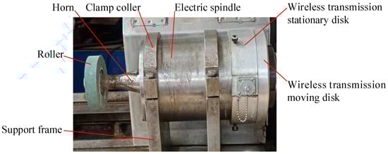 In recent decades, ultrasonic vibration dressing technology [,,] on the grinding wheel has developed rapidly. For ICUECG machining, ultrasonic-assisted dressing technology can be applied to the truing of the conductive grinding wheel. During the ultrasonic-assisted truing of the conductive grinding wheel, ultrasonic vibration is applied to the roller to improve the truing quality of the conductive grinding wheel. The physical object of the on-machine dressing device of the conductive grinding wheel after adding the ultrasonic vibration system is shown in Figure 8.