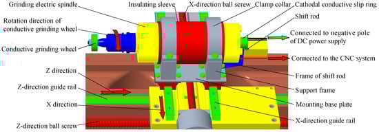 According to the above requirements, the structural design of the grinding electric spindle mounting and fixing device is shown in Figure 9. The device mainly consists of a mounting base plate, support frame, grinding electric spindle, insulating sleeve, clamp collar, cathodal conductive slip ring, X-direction and Z-direction guide rails, and X-direction and Z-direction ball screws. The nominal size of the Z-direction ball screw is 40 mm × 10 mm. The nominal size of the X-direction ball screw is 25 mm × 5 mm. Both adopt a grinding lead screw with an accuracy grade of C7 manufactured by TBI Company. The X-direction guide rail adopts the linear guide rail with the nominal model of SBI30 manufactured by the SBC Company of South Korea. Its surface is subject to an oxidation treatment to ensure its rust resistance. The Z-direction guide rail adopts the V-shaped guide rail provided by the machine bed. An organ shield should protect the X-direction guide rail and ball screw after assembly, and a telescopic cylindrical shield should protect the Z-direction ball screw to prevent corrosion and damage of the guide rail and ball screw caused by electrolyte splash during machining. During the assembly process, the parallelism of the grinding electric spindle and the Z-direction of the machine bed are aligned within 0.01 mm using a dial indicator. The insulating sleeve ensures good insulation between the grinding electric spindle and the machine bed. The cathodal conductive slip ring is installed at the protruding part of the tail of the grinding electric spindle rotor, and the inner ring wire of the cathodal conductive slip ring is connected and fixed on it.
