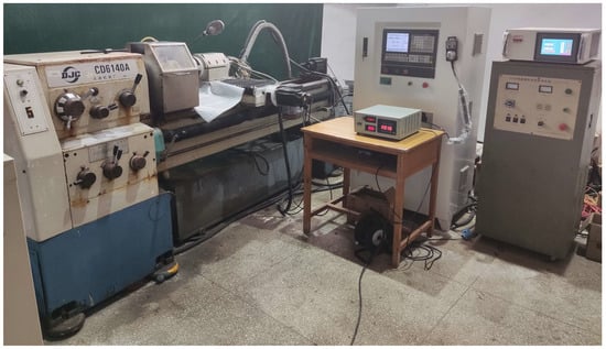 The realized scheme of the special machine tool for ICUAECG is depicted in Figure 10. The machine bed was transformed from a CD6140A lathe. The rapid traverse apron and the saddle of the original lathe were removed, and the ball screw drive mechanism and grinding electric spindle were installed. The carriage and tool rest of the original lathe were removed. The workpiece circumferential feed speed, conductive grinding wheel speed, and axial and radial feed speeds were controlled by the GSK980TDC CNC system. A 150KG24Z10 grinding electric spindle was adopted for machining, with a rated power of 10 kW, working speed of 2000~24,000 r/min, and end-face runout of no more than 1 μm. The radial runout did not exceed 2 μm. The vibration value was not greater than 0.6 mm/s. The HNZM-500 DC power supply had an output voltage of 0~200 V and an output current of 0~50 A. It could adopt two working modes: constant voltage and constant current.