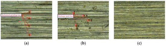 The machining experiments were also carried out for (i) the internal cylindrical ECG with disconnected ultrasonic power supply and (ii) the internal cylindrical ordinary grinding with disconnected ultrasonic and DC power supplies. The respective process parameters are specified in Table 2. The machined surfaces of ordinary grinding, ECG, and ICUAECG were examined via a super-depth field microscope. The comparison of the surface topographies of the machined surfaces magnified 300 times under the three processing conditions is shown in Figure 12.