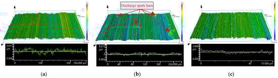It can be seen from Figure 12 that the mechanical grinding traces of the machined surface of the internal cylindrical ECG were less pronounced than those of the internal cylindrical ordinary grinding. Still, the machined surface generated discharge spark burns due to the unstable machining and electrode short circuit [,]. On the machined surface of ICUAECG, the discharge spark burn was effectively avoided. This is because the ultrasonic vibration made the flow field of the electrolyte more uniform than that of ECG, and the electrolytic products were more conducive to discharge from the machining area, leading to the practical improvement of the stability of ECG.