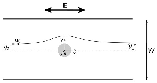 In this work, we study the scattering of colloidal metal particles by a cylindrical insulating post. The particles are suspended in an electrolyte that flows in a microchannel with a prescribed velocity and encounter a post of circular shape. The post distorts the flow streamlines, which recover their original shape past the post. In the absence of an electric field, colloidal particles follow the streamlines, and, therefore, their motion remains unaltered after the post is left behind. Notice that this is the case for particle trajectories not very close to the post, while for trajectories close to the post, there are non-hydrodynamic, short-range interactions that lead to some deviations of the order of the particle diameter [6]. These hard-wall interactions constitute the physical mechanism for particle deviation of the original DLD devices. During the 1990s, experimental and theoretical works on the scattering of a colloidal particle by another particle were performed as a way of studying contact forces [7,8,9]. If an electric field is applied, the distortion of the electric field lines caused by the cylinder gives rise to a non-homogeneous field that leads to dielectrophoretic (DEP) forces on the particles, i.e., a net electrical force on the particle-induced dipole. The application of DEP within arrays of posts for particle concentration [10,11,12] and particle filtration [13,14] has been extensively demonstrated in microfluidics experiments. It has recently been shown how to fabricate and use arrays of metal posts for the DEP deviation of microparticles within microchannels [15]. Besides the DEP force, the particle also undergoes an electrical wall repulsion arising from the image dipole. Furthermore, AC electric fields induce quadrupolar electroosmotic flows around metal colloids that can give rise to particle-wall repulsion, as observed in electrophoresis experiments for nonmetal colloids [16] and particle-particle interactions [17,18]. All these electrical interactions are able to modify particle trajectories from the original streamlines. We use numerical simulations to study the interplay of these phenomena on the scattering due to the post. The main novelty in these simulations is the interaction with the post due to the quadrupolar electroosmotic flows induced on the particles. For example, we demonstrate that the repulsion due to these flows is stronger than the particle repulsion with its image dipole. The latter interaction decays with distance as , while the repulsion due to the quadrupolar electrosmostic flows does so as . In addition to its fundamental interest, these results will find applications in the design of microfluidic devices that combine obstacles and/or constrictions with electric fields for particle separation and fractionation [10,19].