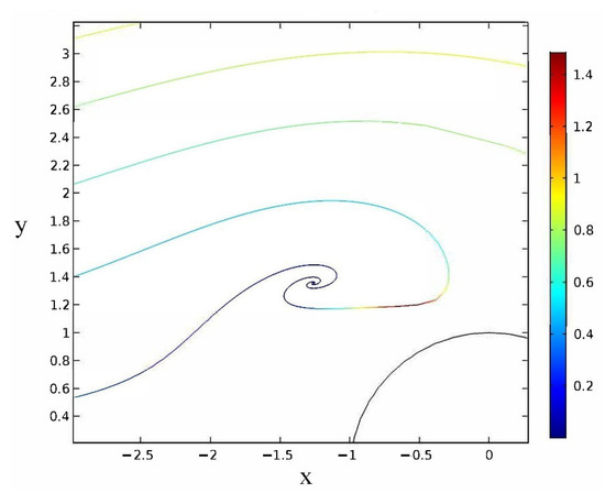 For case (a), the main effect is the ICEO interaction. Interestingly, there are trajectories where the flow velocity is balanced by the ICEO repulsion so that the particle reaches an equilibrium position on the left of the cylinder. A zoom of these trajectories is shown in Figure 4. Those trajectories that reach the exit present , that is, the vertical positions at the exit are smaller than the vertical positions at the entrance. In this case, particles are attracted to the post because there is an important component of the electric field , which makes the trajectories bend towards the center of the channel.