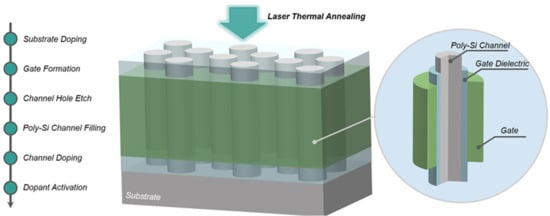 With the continuous development of smartphones, 5G, and data centers, the market demand for higher bit density has grown rapidly. The bit density is generally increased by stacking more layers in 3D NAND Flash [,,,,,,,]. However, stacking more layers makes integrated processes more complex, leading to worse wafer stress [,,] and leakage caused by fluorine attack []. Meanwhile, the doping profile of vertical select transistors needs to be well controlled for better performance. This limits the high-temperature process for the vertical select transistor channel dopant activation. Therefore, the vertical select transistor must be forced to accept the low temperature to activate the channel dopant. To transition to the higher dopant activation process, laser thermal annealing (LTA) can achieve and meet the requirements of a low thermal budget. The LTA is well applied in power devices extending the Si-based devices with μm-scale deep activation [,,], CMOS logic, and 3D sequential integration for active area formation and source/drain activation [,,]. However, LTA has been less studied for memory applications compared with these fields. In the DRAM field, polysilicon contact plug annealing [] is considered to remove voids with LTA. While in 3D NAND Flash, Lisoni et al. proposed the use of LTA to crystallize amorphous silicon channel in vertical channel transistors [], thus optimizing the grain size. Son et al. used numerical simulation to study the laser conditions with multipath and beam overlap to improve temperature uniformity within the annealed area []. However, channel dopant activation in vertical transistors has not been studied. Therefore, it is essential to study the dopant activation and Poly-Si channel grains of vertical channel transistors for 3D NAND Flash application.