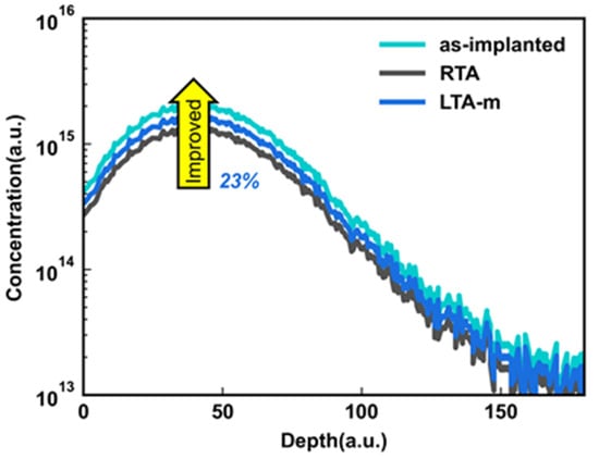 Measured boron concentration after ion implantation as implanted SIMS. Simulated the boron concentration of subsequent activation with RTA and LTA-m by Sentaurus TCAD.