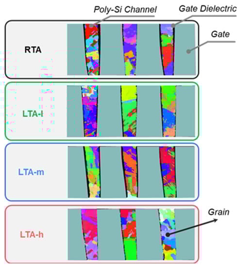 Figure 2 shows the Id-Vg characteristics of the RTA and LTA m J/cm2(LTA-m). LTA-m shows a higher threshold voltage (Vth). To determine the cause, the PED is used to quantify the grain size of analyzed samples, and the LTA-m obtains a larger grain size than RTA. Then the grain size distribution was applied to the Sentaurus TCAD simulation based on [], and the dopant activation rate of fitted Id-Vg curves was extracted. The simulation shown in Figure 3 shows that the boron activation rate of LTA-m is at least 23% higher than the RTA method. The enlarged grain size with fewer grain boundaries leads to fewer traps. This indicates that the LTA can enhance dopant activation. Meanwhile, the Poly-Si recrystallization can be enhanced for larger grain sizes.
