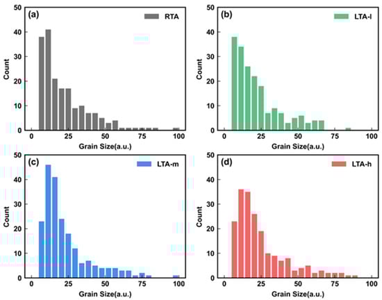 The statistics of grain size distribution with different thermal conditions, (a) RTA, (b) LTA-l, (c) LTA-m, and (d) LTA-h.
