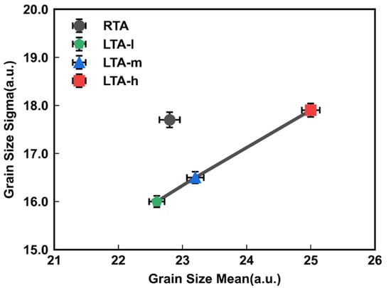 The correlation between grain size mean and grain size sigma of the Poly-Si channel with different thermal conditions, RTA, LTA-l, LTA-m, and LTA-h. The bars represent mean values, with the error bars showing standard deviation.