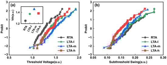 Next, the influence of different LTA energy densities on the electrical characteristics of vertical channel transistors is studied. The electrical measurements come from more than 50 vertical transistors of each die. The statistical distribution of Vth and subthreshold swing(SS) are shown in Figure 7. A clear inverted U-shaped trend between LTA energy density and Vth, the largest LTA energy density LTA-h, shows a smaller Vth in the inset of Figure 7a. The Vth is affected by the activation rate of boron in the channel and traps in the Poly-Si channel. A larger activation rate leads to a larger Vth. Larger grain size with fewer traps leads to smaller Vth. After the energy density reaches LTA-h, the traps in the Poly-Si channel are significantly reduced in larger grain size, leading to a smaller Vth. Finally, the inverted U-shaped trend is formed, while in Figure 7b, the trend of SS is related to the grain size, and a clear improvement is made in SS with the larger LTA energy density. Consequently, LTA improves the grain size distribution in the boron-doped Poly-Si channel. The dose of channel doping with LTA could be further optimized to minimize the large dose impact. The vertical channel transistor could obtain better performance.
