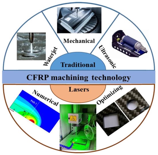 The carbon fiber-reinforced composites (CFRP) have the advantages of high specific strength, low density, light weight and have become a key material for the aerospace and new energy vehicle light-weight manufacturing [,]. CFRP machining is an important process in its application. The machining methods include mechanical and special processing technique as shown in Figure 1 [,,,].