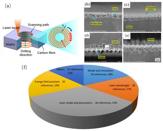 (a) Cutting hole in CFRP plate; (b–e) HAZ, crack, broken fibre produced in laser cutting process; Reprinted/adapted with permission from Ref. []; (f) Different aspects of CFRP laser machining. Copyright 2021, Elsevier.