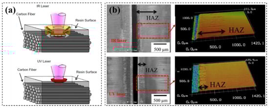 (a) Material removed mechanism for UV and IR lasers. (b) HAZ for CFRP cutting with IR and UV lasers Reprinted/adapted with permission from Ref. []. Copyright 2016, Elsevier.