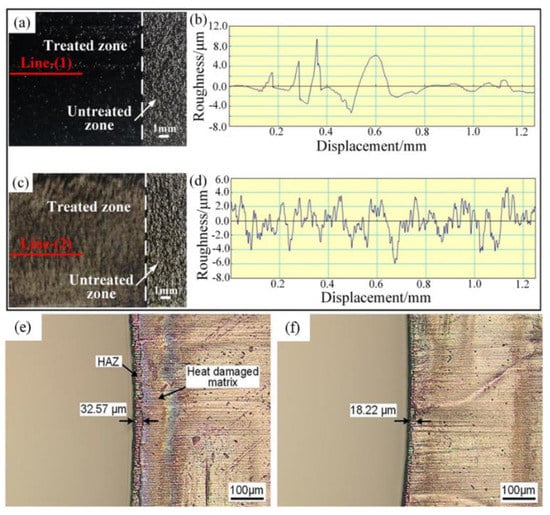 Yun et al. [] studied IR laser surface treatment and UV laser surface treatment of CFRP laminates under different laser treatment parameters and analyzed their microstructure characteristics and the results of energy dispersive spectroscopy (EDS). The results showed that the thermal effect of IR laser leads to the combustion of carbon fibers, and the UV laser surface treatment without thermal effect ensures the integrity of carbon fibers (Figure 5a–d). Hong et al. [] studied the IR laser surface treatment and peeling layer treatment of various laser processing parameters. The results showed that the average shear strength of the adhesive joint obtained by IR laser treatment is 20.158 MPa, while the average shear strength of the joint obtained by peeling layer treatment is 32.574 MPa. Yuan et al. [] proposed a staggered scanning mode (ISM) based on the top-down default sequential scanning mode (SSM) of the multi-layer concentric circle filling scanning process, which improves the surface quality of CFRP plates through nanosecond ultraviolet laser drilling. Compared with SSM, the overall average HAZ width of ISMs is reduced by 25.85% by reducing the heat accumulation effect of adjacent tracks (Figure 5e–f). Yu et al. [] controlled the scanning speed of UV laser, and the surface of CFRP was completely cleaned and partially cleaned. The results show that the main damage form of CFRP bonded joints obtained by complete and partial UV laser cleaning is mixed damage, in which interface damage and cohesive damage play an important role in the tensile properties of the two types of joints respectively.