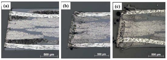 (a) Cutting CFRP with picosecond laser (laser power 50 W, Pulse duration 6 ps, cutting speed 15 m/min); (b) nanosecond laser (laser power 750 W, Pulse duration 30 ns, cutting speed 15 m/min); (c) CW lasers (laser power 4000 W, cutting speed 9.1 m/min). Reprinted/adapted with permission from Ref. []. Copyright 2014, Elsevier.