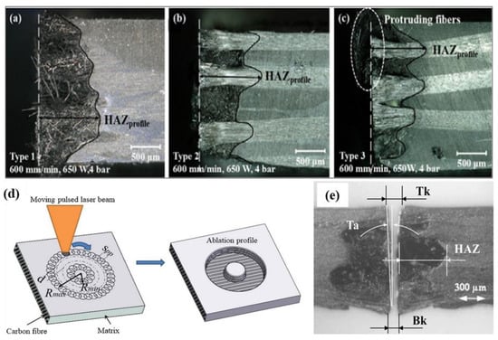Jun [] cut a CFRP-laminated plate overlay structure with fiber lasers and adjusted the processing parameters to study the change of the surface quality of the laminated plate. The results showed that the HAZ level of laser cutting CFRP laminates is highly related to the fiber orientation, laser power and cutting speed (Figure 8a–c). Tao [] studied and proposed a new double beam dislocation (DBOD) laser drilling technology (Figure 8d). The thickness of CFRP specimen reaches 10 mm by using DBOD process, which is significantly improved compared with other studies. Leone et al. [] used 150W Nd: YAG pulse laser to cut 1 mm thick CFRP plate. It is found that the laser used can cut CFRP plates with a maximum speed of 12 mm/s (Figure 8e).