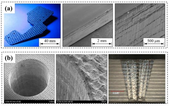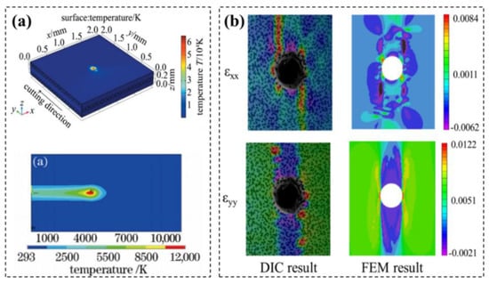 Based on the mathematical model of CFRP laser machining, lots of works were carried out by numerical method. Ohkubo [] used the finite element volume method to perform a three-dimensional numerical simulation of the laser processing of CFRP, and the simulation results showed that the cross-sectional quality can be improved by adjusting the processing parameters and the appropriate value of carbon fiber and resin removal speed was achieved (Figure 17a). Li [] established the progressive damage failure mode of open-hole CFRP laminate based on the two-dimensional Hashin failure criterion by using ABAQUS finite element software, and the results showed that the full-field stress distribution is non-uniform and asymmetrical, and the crack propagation and failure modes are consistent with the development of high-level strain around the hole. At the same time, it was also found that the full-field strain of CRRP plates is closely related to tensile load level and fiber orientation, and the numerical model results is consistent with the experimental results well (Figure 17b).