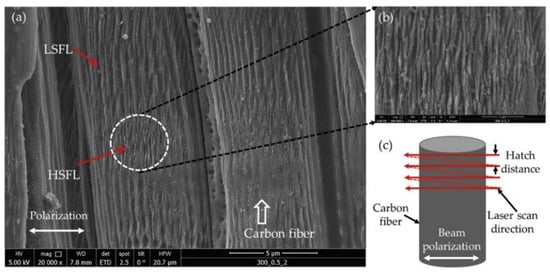 (a) Formation of laser induced periodic surface structure on carbon fiber surface (b) high spatial frequency laser induced periodic surface structure (HSFL)micrograph, and (c) schematic of scanning and beam polarization direction Reprinted/adapted with permission from Ref. []. Copyright 2020, Elsevier.