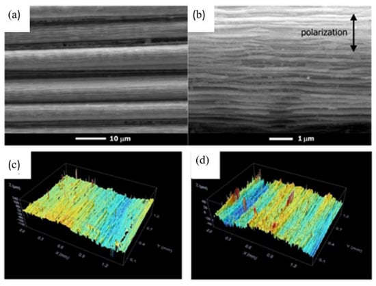 (a,b) SEM images of the central region of laser tracks produced with 0.35 mJ and 5 mm/s Reprinted/adapted with permission from Ref. []; Copyright 2017, Elsevier. (c,d) Pictures showing surface topography of GFRP Reprinted/adapted with permission from Ref. []. Copyright 2013, Elsevier.