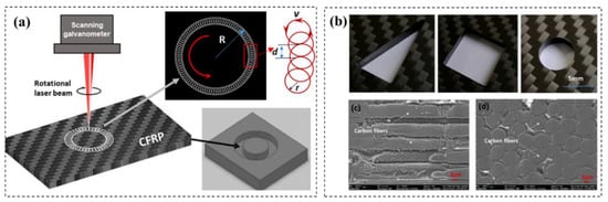 (a) CFRP high-speed laser rotary cutting technology with picosecond laser; (b) cutting CFRP for different shapes;(c,d) Micro schematic diagram after cutting. Reprinted/adapted with permission from Ref. []. Copyright 2021, Elsevier.