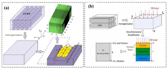 Theoretical models of CFRP laser machining can lay a theoretical foundation for experiments and numerical simulations. Xu et al. [] proposed a numerical model to study the material removal mechanism of CFRP laser grinding (Figure 16a). Through parameter analysis, it is found that the distance between two adjacent laser pulses with completely degenerated matrix should be used to effectively utilize mechanical erosion. Li et al. [] proposed a one-dimensional transient model, which is based on the volume ablation of carbon fiber composites by continuous high power density lasers (Figure 16b). It was found that the higher the laser power density is, the smaller the pyrolysis zone is. Ge et al. [] analyzed and compared the ultrasonic echo signals with different defect characteristics in CFRP and calculated the depth and length of the defect according to the time of longitudinal scattering wave (Lr) reaching the depth. It was found that the error of defect depth and length calculated by this method can be controlled within 7% and 5%. Chen et al. [] used continuous wave fiber-reinforced laser to cut 2.0 mm thick carbon fiber-reinforced polymer laminate, established a modified thermal conductivity model, analyzed the heat transfer in unidirectional carbon fiber-reinforced polymer laminate, and compared with the experimental results, found that the model can be used for pretreatment.