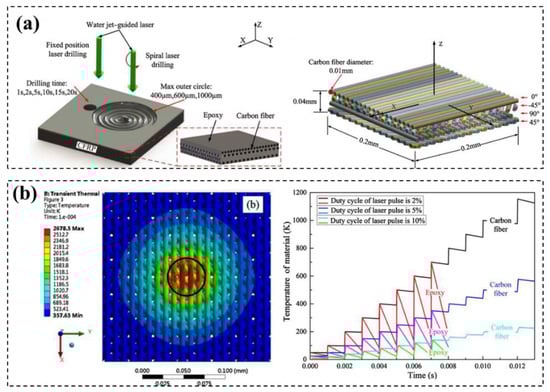 Based on the “element birth and death” technique in the finite element method, the three-dimensional transient temperature field of heterogeneous fiber matrix and the subsequent material removal model are established by Zhang []. Under this model, the influence of the duty cycle of laser pulse on the temperature field distribution of materials was studied, and the model was verified by experiments under the same process conditions (Figure 18). The results showed that CFRP composites processed by water jet-guided laser processing have obvious advantages over traditional laser processing. Adjusting the duty cycle of laser pulses affects the shape and temperature distribution of the composites after drilling.