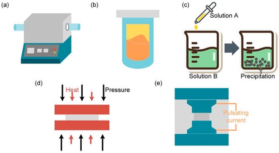 The synthesis method of bulk thermoelectric material. (a) Vacuum smelting method, (b) solvothermal method, (c) co-precipitation method, (d) thermal pressing method, (e) spark plasma sintering.