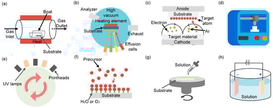 The preparation method of the thermoelectric film. (a) Chemical vapor deposition technology, (b) molecular beam epitaxy, (c) magnetron sputtering technique, (d) 3D printing technology, (e) ink printing technology, (f) atomic layer deposition technology, (g) solution processing method, (h) electrodeposition technology.