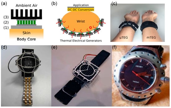 (a) Schematic diagram of the heat collector module on the human body: (1) the thermal interface of the heat source/skin, (2) the TEG used for thermal power conversion, and (3) the radiator emits the heat into the ambient air. (b) Schematic diagram of the wrist body thermal drive wearable devices, including an energy collector, DC–DC conversion and storage, and application circuits. (c) Pictures of the collected wrist bands: mTEG (macroscopic thermo-legs fabricated by classic fabrication technology) and μTEG (a higher number and density thermo-legs produced with micro-fabrication techniques). Reprinted with permission from []. Copyright 2017, Elsevier. Design examples of wearable TEG. (d) A waterproof version of the “Mini-Matrix 2R” containing 24 thermoelectric reactors; (e) a “five to seven” design with 32 thermoelectric reactors and a pin radiator. Reprinted with permission from []. Copyright 2007, IEEE-INST ELECTRICAL ELECTRONICS ENGINEERS, INC. The metal electric shock protection grid above the TEG does not contact the radiator. (f) Photo picture of thermoelectric watches. Reprinted with permission from []. Copyright 1999, IEEE-INST ELECTRICAL ELECTRONICS ENGINEERS, INC.