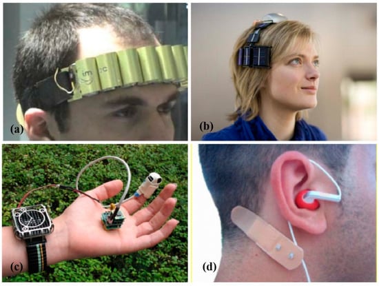 (a) Thermal power supply wireless EEG on the headband. (b) Wearable headset-type wireless EEG system with hybrid power supply. Reprinted with permission from []. Copyright 2009, IEEE-INST ELECTRICAL ELECTRONICS ENGINEERS INC. (c) “Watch” type TEG (left), an electronic device with a wireless module (center), and a commercial finger pulse oximeter (right). (d) Biomedical hearing aids.