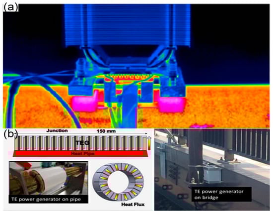 There has been a long history of TEGs being used in the field of architecture, and they have been commercialized, as shown in Figure 6a. The buildings are full of populations who live or work inside and, therefore, they can produce large amounts of heat losses, which are opportunities for TEGs. The thermal qualities of general buildings are excellent, so their temperatures change very slowly. Therefore, when there are temperature fluctuations in the weather, these fluctuations may lead to local temperature gradients that allow the TEG-powered sensors to operate. Wang et al. [] believed that many high-voltage AC units, water heaters, boilers, hot water pipes, and other heating units existing in modern buildings are all potential heat sources. For example, Lezzi et al. [] designed and implemented a radial TEG integrating thermal pipe insulation, which can power the sensor circuits with wireless transmission capacity and make good use of the waste heat generated by the hot water pipeline (Figure 7b). The waste heat in buildings is tremendous; if they could be effectively exploited, this may somehow alleviate the energy supply problem.