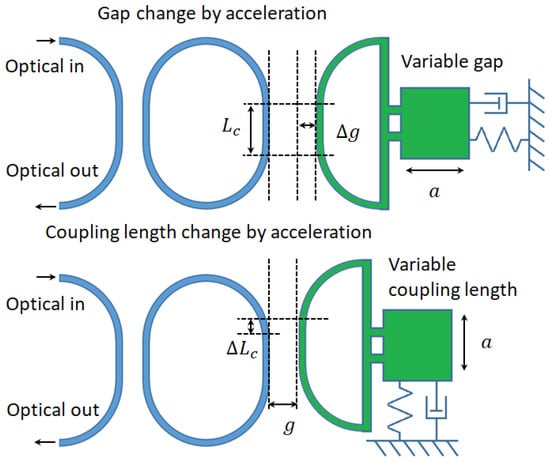The sensing accuracy can be improved by the optical mode localization sensing mechanism. For ring circuitry, mode localization can be obtained from the coupled resonator optical waveguide system (CROW) with two rings. Regarding the short measurement range by modulating the coupling gap, the inertial displacement change in coupling length is a better choice. The possible configurations are shown in Figure 2.