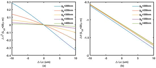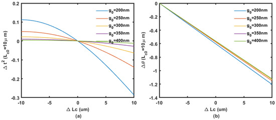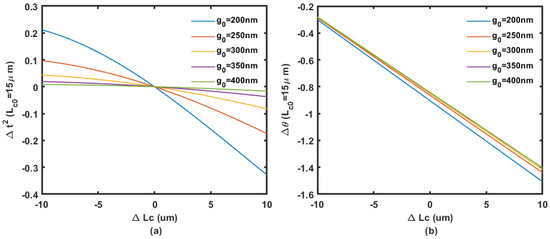 To solve the and at λ = 1.55 μm, the refractive index of silicon, the waveguide width, and thickness is set at 3.48, 450 nm, and 220 nm, respectively. The phase shift change and the change in coupling coefficient at different initial coupling gap solved by COMSOL Multiphysics simulation ( and ) are shown in Figure 4, Figure 5 and Figure 6.