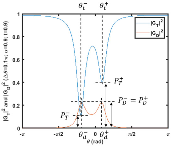 Notations for resonant peaks in and with Δθ = 0.1π. The power transmission of the resonant peaks is denoted by to describe resonant peaks on the left (−) and right (+) hand side. denotes the phase of the resonant peaks [11].