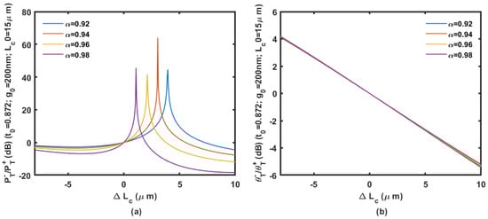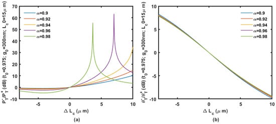 The power ratio (a) and phase ratio (b) according to the displacement change ΔLc with an initial gap of 300 nm and coupling length of 15 μm.
