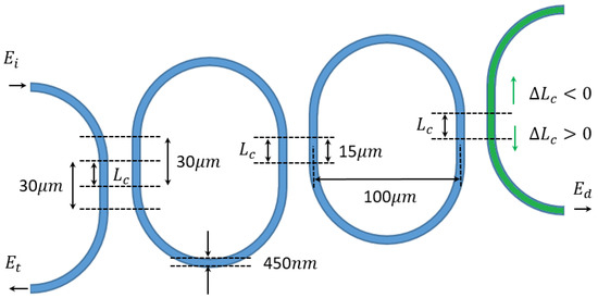 To achieve the inertial displacement detection in two directions, the couplers between ring resonators should be designed with necessary misalignment as shown in Figure 12. This misalignment allows the coupling length to decrease when the proof mass moves upward and increases when the proof mass moves downward, while the regular directional couplers only decrease the coupling length.