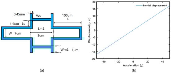 The expected inertial force corresponding to the spring design under 50 g acceleration is 10 nN, which is expected from 400 μm × 400 μm with 50% area occupied with etch holes. The mass is designed in a rectangular shape with two springs on each side connected with anchors. Each of the springs is constructed with 10 periods connected in series. The basic unit of the spring design and the displacement of the described spring-mass system under linear acceleration is shown in Figure 14. The spring constant is 28.8 N/μm (2.94 g/μm). The simulation results show good linearity.