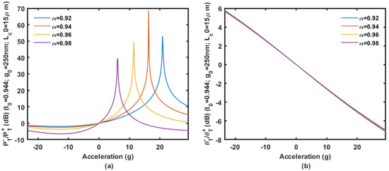 Thanks to the large available amplitude ratio, MEMS mode-localized accelerometers can achieve high sensitivity in a limited measurement range. According to calculation results in Section 2, both resonant phase ratio and power ratio can be good sensing output in our accelerometer design with the variable length configuration. If the detectable power ratio is 30 dB in practice, the available amplitude ratio can be more than 1000. The phase ratio can be more than 55 in Section 2.