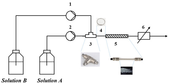 All valves and tubes (inside diameter (I.D.), 0.75 mm; outer diameter (O.D.), 1.60 mm) were made of 316L stainless steel. Among them, the micromixer was a T-type mixing tee (I.D., 0.25 mm); the micropacked bed reactor was a pipeline (I.D., 4 mm; O.D., 6 mm) filled with glass beads supported by PTFE meshes (0.150 mm) at both ends. Four kinds of glass beads (ASONE Co.) were used, of which the size was 0.105~0.125 mm, 0.177~0.250 mm, 0.350~0.500 mm, and 0.500~0.710 mm, respectively, and the void fraction was determined to be 33%, 34%, 38%, and 40%, respectively.