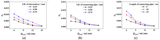 Herein, we used the same micropacked bed following different T-type micromixers and connecting tubes to investigate the effects of upstream elements. In detail, we changed the I.D. of the micromixer, the I.D. of the connecting pipe, and the length of the connecting pipe separately. Figure 3a presents the effect of the I.D. of the micromixer. When the total flow rate was 9 mL/min, XS corresponding to the micromixers with the I.D. of 0.75 mm, 0.50 mm, and 0.25 mm were 0.00617, 0.00467, and 0.00324, respectively. In general, the smaller the I.D. of the micromixer was, the smaller XS was, reflecting the better micromixing performance since the decrease in internal diameter decreases the mass transfer distance and accelerates the mixing. Similarly, as shown in Figure 3b, better mixing performance can be achieved by using a connecting pipe with a smaller I.D. The influence of the length of the connecting pipe was shown in Figure 3c: when the flow rate was relatively high, the XS of different connecting pipe lengths were similar; when the flow rate was relatively low, the shorter connecting pipe seemed to correspond to smaller XS. In fact, mixing took place in every element, including the T-type micromixer, the connecting pipe, and the packed bed. In case we observed a lower total byproduct yield (lower XS) by adding a further element downstream, it indicates that mixing was not complete in the upper elements. In this specific case, mixing was not completed in the T-type micromixer and the connecting pipe and then finalized in the packed bed. In the case of long connecting pipes, triiodide was predominantly formed in the connecting pipes. Hardly any triiodide would be formed in the more effective mixing unit ‘packed bed’. On the contrary, the shorter the connecting pipes, the lower the triiodide concentration because the byproduct would not form in time in the connecting pipes without enhanced mixing.