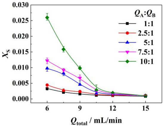 The influence of the different ratios of flow rates (QA:QB) on the mixing performance was also investigated, as shown in Figure 5. It can be found that increasing the ratio of flow rates from 1:1 caused poor mixing performance. For example, setting the total flow rate at 9 mL/min, when the ratio of flow rates increased from 5:1 to 10:1, XS increased from 0.00460 to 0.00983. The influence of the ratio of flow rates on the mixing performance may be caused by the distribution of the two fluids in the microreactor [14]: under laminar flow regimes; when the ratio of flow rates was large, the flow rate was low for the fluid from the perpendicular inlet of T-type micromixer, and which may be compressed into a thin layer in the downstream pipe and left larger distance for mass transfer in a continuous fluid. In other words, a long distance was required for the dispersed fluid to diffuse throughout the downstream pipe, corresponding to high XS. Since the secondary crushing in the micropacked bed can provide the re-collision and mixing of the fluid, the compression of the dispersed fluid may be avoided to some extent, which was expected to improve the mixing performance at a large ratio of flow rates effectively.