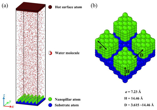 The simulation model is composed of two surfaces and four thousand water molecules in a computational region of size 130 Å × 130 Å × 564 Å. Periodic boundary conditions are applied in all three spatial dimensions. The initial configuration of the system is shown in Figure 1a. As the condensation material, water molecules are initially distributed in a discrete manner. Specifically, a cold nanopillar surface is placed at the bottom of the system to serve as a substrate for water vapor condensation, and a hot flat surface is placed at the top of the system to ensure that all water molecules can condense on the topside of the nanopillar surface. Both the flat surface and the nanopillar surface are composed of Cu-like atoms with a face-centered cubic (FCC) crystal structure, and the lattice constant equals 3.615 Å. The nanopillar surface is composed of a smooth substrate and the nanopillars grown on the substrate. The structural parameters are defined as shown in Figure 1b, and the detailed description about these geometric parameters are given in the Supplementary Materials.
