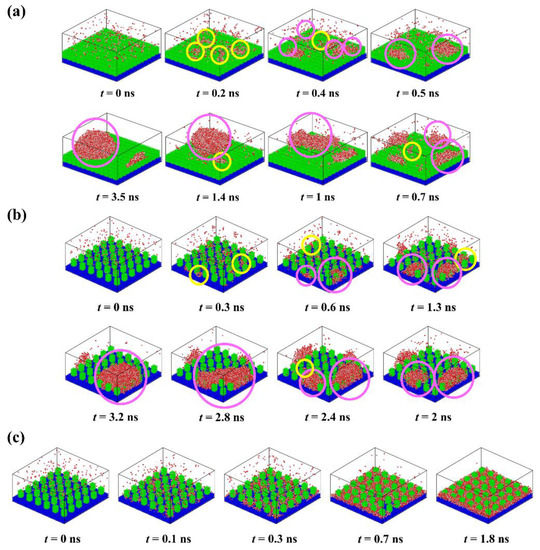 To understand the condensation behavior of water vapor on rough surfaces, detailed descriptions of the formation process of each typical condensate are provided, as shown in Figure 3. At the beginning of the simulation, the molecules in the water vapor collide with each other due to random thermal motion. Some water molecules close to the surface collide with surface atoms and thus form clusters deposited on the surface. The water molecules in these clusters lose some kinetic energy, the corresponding thermal energy was absorbed by the surface. Subsequently, the clusters will become larger as more water molecules aggregate, or they may become smaller as the water molecules within them return into the water vapor, which exhibits the instability of small clusters. For the surface P0.4S0.4D1 (Figure 3a), water clusters are deposited on top of the nanopillars to form randomly distributed nuclei because water molecules cannot enter the narrow gaps when the interpillar spacing is D1. With the growth and irregular thermal motion of the nuclei, they merge with adjacent nuclei and grow up into nanodroplets. Afterwards, the condensed droplets grow up into Cassie-Baxter droplets by absorbing more water molecules or merging with newly condensed nuclei on the surface. Due to the limited number of water molecules in the simulated domain, condensation process ends when all water molecules have condensed on the surface. For the surface P0.25S0.25D3 (Figure 3b), water molecules are preferentially deposited in the gaps between the nanopillars, which is consistent with the conclusions obtained by Xu et al. and Du et al. using the classical nucleation theory [43,44]. The nuclei grow up by the addition of water molecules, but their movement is restricted by the nanopillars. As the nuclei grow, they merge with adjacent nuclei and grow up into nanodroplets. After growth and repeated coalescence, the nanodroplets grow up into Wenzel droplets. For the surface P0.4S0.4D3 (Figure 3c), water molecules are rapidly deposited in the gaps and form dense nuclei due to the strong attraction of the hydrophilic surface to water molecules. The nuclei easily merge with each other and form a water film filled in the gaps with a thickness of about two–three water molecules. Then, the water film thickens by absorbing water molecules. These findings show that the condensation process involves cluster formation, nucleation, and the emergence of nanodroplets (or water films). Additionally, snapshots of condensation process on all the proposed nanopillar surfaces are given in the Supplementary Materials (Figures S3–S7).
