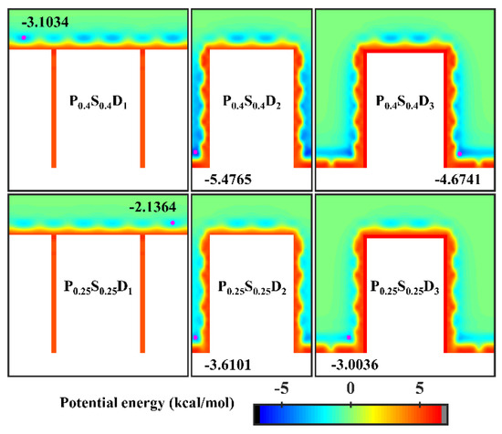 To further study the effects of the geometric parameters and wettability distribution of the nanopillar surface on the condensation mode, the preferential condensation location of water molecules during condensation and the influence of the surface on the condensate morphology are analyzed through potential energy. According to the standard 12-6 LJ potential, the potential energy between a single water molecule and various nanopillar surfaces is calculated. Figure 5 presents the equipotential curves of potential energy in the cases of nanopillar surfaces with uniform wettability. As one can see, the surface geometric parameters greatly affect the potential energy distribution on the nanopillar surface and thus the condensation process of water vapor on the nanostructured surface. When the interpillar spacing is D1, the extremely high energy barrier prevents water molecules from entering the gaps between the nanopillars, which causes the condensed droplets to be in the Cassie-Baxter state. Since the potential energy near the hydrophilic nanopillar surface is lower than that near the hydrophobic surface, more water molecules condense on the surface P0.4S0.4D1. However, as the interpillar spacing increases (D2 and D3), the energy barrier in the gaps disappears and the gaps become negative potential energy, so the water molecules are inclined to condense in the gaps. As shown in Figure 2b,c, water molecules randomly condense into multiple small clusters in the gaps at the onset of condensation, and then the clusters merge and grow. Due to the low potential energy near the hydrophilic nanopillar surface, the condensed water molecules eventually evolve into a water film overlying the surface. However, the hydrophobic nanopillar surface does not attract water molecules as strongly as the hydrophilic surface, so the water clusters gradually form Wenzel droplets immersed in the gap as they merge and grow. It should be noted that the dimensions of the white region (referring to the nanopillar and the substrate) in all energy curves in this work have considered the atomic radius of Cu, ~ 1.28 Å. Based on this, the nanopillar width is ca. 9.79 Å in the figure.