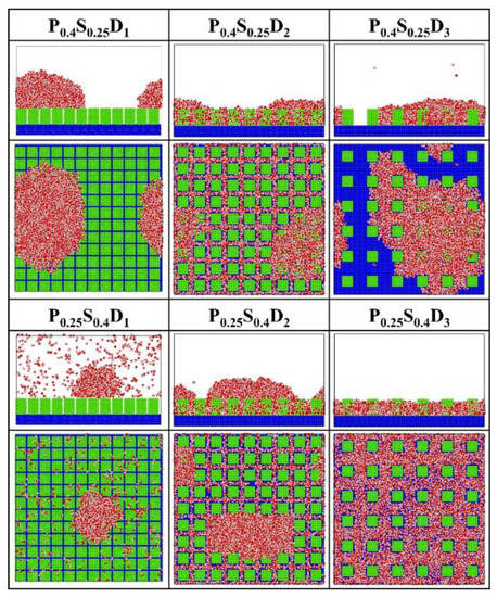 For the surface P0.25S0.4D2, at the beginning of condensation, water molecules condensed into a water film of about two–three water molecules thickness in the gaps between the structure. Subsequently, the water film thickness increases and becomes larger than the nanopillar height. The condensed water above the nanopillar changes into a spherical crown shape to achieve a stable state. In this stage, due to the weak restriction of water molecules by hydrophobic nanopillars, the water molecules in the upper part of the gaps are easily attracted by the crown condensate and leave the gap; on the contrary, the water molecules in the lower part of the gaps remain in the gap due to the strong attraction of the hydrophilic substrate to these water molecules. Since some water molecules move from the gaps to the top of the nanopillar during the simulation, this process is formulated as dewetting-like behavior based on liquid film. However, for the surfaces P0.4S0.4D2 and P0.4S0.25D2, the hydrophilic nanopillars strongly attract the water molecules in the upper part of the gaps, so that they remain in the gap, and therefore no dewetting-like behavior occurs. Moreover, for the surface P0.25S0.4D3, almost all the water molecules condensed in the enlarged gaps without staying at the top of the nanopillar, so no dewetting-like behavior occurred either.