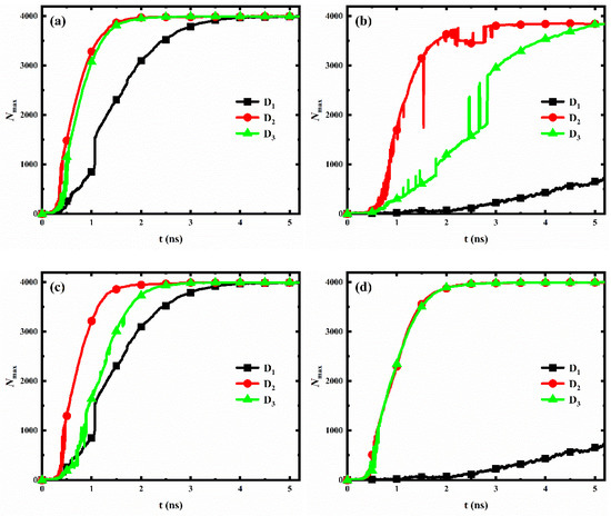 For each wettability distribution, the evolution of the number of water molecules in the largest size condensed clusters on the nanopillar surfaces with different interpillar spacing is shown in Figure 9. Clearly, for nanopillar surfaces with uniform wettability (Figure 9a,b) or nanopillar surfaces with hydrophobic substrate and hydrophilic nanopillars (Figure 9c), the condensation rate of the nanopillar surface has the same trend with the changed interpillar spacing, i.e., v2 > v3 > v1, where vi denotes the condensation rate of nanopillar surfaces with interpillar spacing Di. However, for nanopillar surfaces with hydrophilic substrate and hydrophobic nanopillars (Figure 9d), the condensation rates are similar when the interpillar spacing is D2 and D3, and significantly slower when the interpillar spacing is D1, i.e., v2 ≈ v3 > v1.