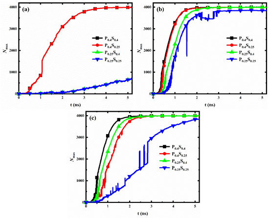 However, the variation of the condensation rate observed in our simulation results differs from the general conclusions obtained by previous work. Gao et al. [36] analyzed the condensation on nanopillar surfaces with different solid fractions (, where a is the width of nanopillar and D is the interpillar spacing, as shown in Figure 1b), and they found that the condensation rate of nanopillar surface decreases with the decrease of surface solid fraction. According to their conclusion, the condensation rate of our model should be consistent with v1 > v2 > v3, which is clearly inconsistent with our observations mentioned above. Here, to accurately reflect the influence of geometric parameters on the condensation rate of the nanopillar surface at the nanoscale, a parameter is proposed, namely the effective contact area fraction (). This parameter refers to the ratio of the actual surface area where the nanopillars in contact with water molecules to the total geometric surface area of the nanopillar surface. Based on the geometric parameters of the nanopillar surface defined in Figure 1b, . However, water molecules cannot enter the gaps between the nanopillars when the interpillar spacing is D1. So, . The surface solid fraction, the effective contact area fraction and the surface roughness of nanopillar surfaces with different interpillar spacing are given in Table 2. Clearly, the effective contact area fraction for the nanopillar surfaces defined in the present work have the following relation: , which is consistent with the observed variation law of the condensation rate. This suggests that, at the nanoscale, the effective contact area fraction can more accurately reflect the influence of geometric parameters on the condensation rate of the nanopillar surface compared to the surface solid fraction. Specifically, the condensation rate of the nanopillar surface increases with the increase of the effective contact area fraction. Notably, although the surface P0.4S0.4D2 has a larger effective contact area compared to that of the surface P0.4S0.4D3, it does not show a significantly faster condensation rate, as shown in Figure 9a. This might be due to the uncertainty in the analysis data. As was well known, the molecular dynamics method is a deterministic method. Once the initial configuration and velocity are determined, the trajectory of the molecules over time is also determined. However, during the actual simulation, the trajectories of the atoms in the same model may vary in multiple simulations due to differences in settings, algorithm selection, and computational equipment, while the structural characteristics and properties of the overall system remain basically stable. Since the analysis data in Figure 9 (Nmax) are sensitive to the atomic positions in the simulation, there is a degree of uncertainty in the statistics of this data. According to the effective contact area fraction, condensation on the surface P0.4S0.4D2 should be faster than that on the surface P0.4S0.4D3.
